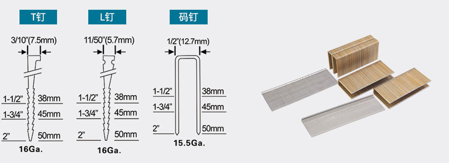 可以打三种钉子L钉,T钉,码钉,用于实木地板安装
